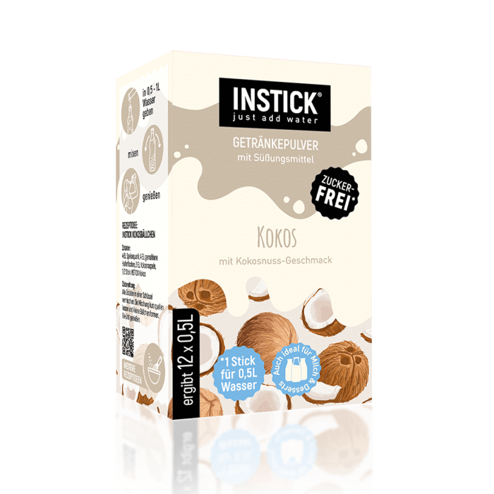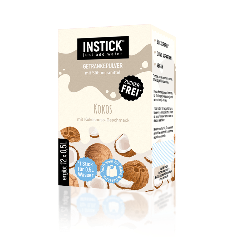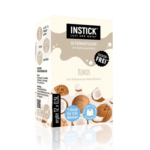 12 sticks for preparing a low-calorie, sugar-free drink with coconut flavor – for mixing with water, milk, or milk alternatives